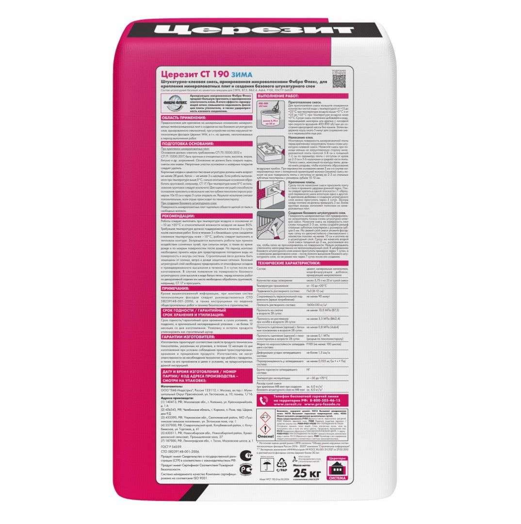 Описание товара: "Штукатурно-клеевая смесь Ceresit СТ 190 для МВ плит Зима (25 кг)"