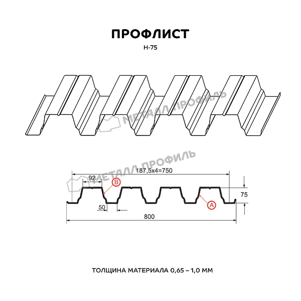 Профлист МЕТАЛЛ ПРОФИЛЬ Н-75x750-B (ОЦ-01-БЦ-0,8) — популярный материал для оформления профилированного листа. Изначально он представляет собой лист оцинкованной стали с покрытием. Толщина металла с цинковым и полимерным слоем составляет 0.8 мм. После проката на специальном оборудовании металл приобретает рисунок из повторяющихся волн. Жёсткость профилированного листа на порядок выше плоского.